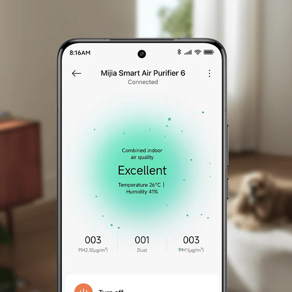 שליטה מלאה ביישום Xiaomi Home ותצוגת כל המדדים כולל: מצבי פעולה, מהירות סינון, תזמון הפעלה, מדידת איכות אויר ב-4 רמות (צבעים שונים) , מצב UV, מחולל יונים, התרעת החלפת מסנן, טמפרטורה ולחות, מצב הפעלה בלילה ונעילת ילדים.